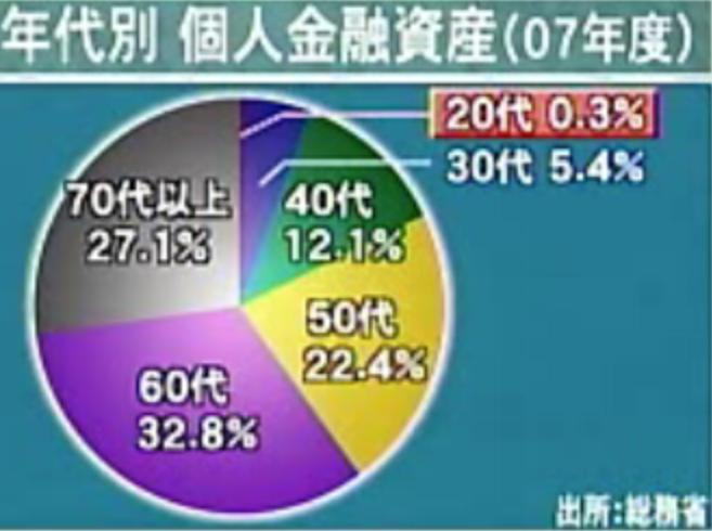 日本の個人金融資産は若年層は持っていません。特に60代~70代で半分以上を占めています。銀行に預けっぱなしなんですね。デフレ下の勝ち組は個人金融資産を沢山もっている日本の高齢者であることが読み取れます。