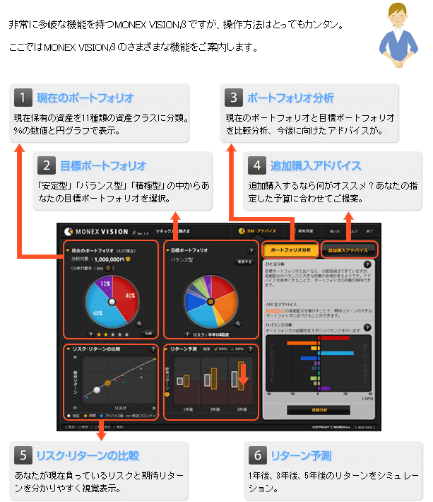最新の金融工学で、「効率的フロンティア(同じリスクでもリターンが高い、高効率性のポートフォリオ)」を狙えます。MONEX ONEの情報を更新して、MONEX VISIONに取り込めば、一瞬で分析してくれます。
