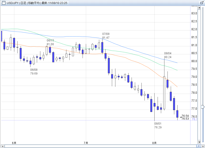 為替が大きく動いています。ドル円が76.34円まで円高が進み、このラインを試しています。このラインは野田財務相が「いい介入だった」と自画自賛していた4.5兆円分のドル買い円売り介入をしたラインです。