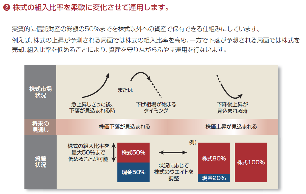 これは突き詰めれば結局「投資のタイミング」になってしまうかも知れませんが、現金/株式の比率(ウェイト調整)で対応することでタイミングの予想と市場の動きをなんとか合わせようとする投資手法だと思います。