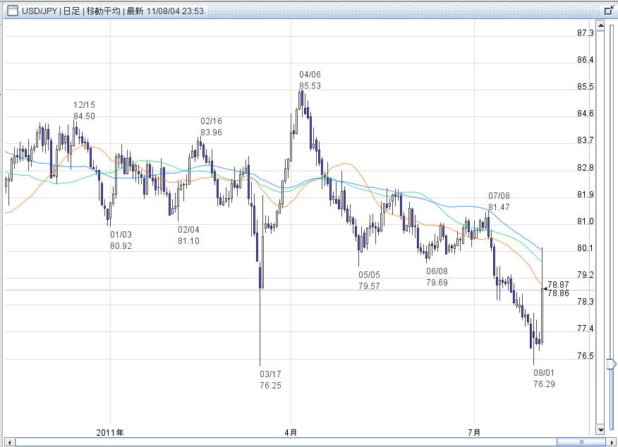 スタンダード・アンド・プアーズが米国債の格下げを発表。米国債がトリプルAからダブルプラスAに格下げになりました。まあ、当然と言える格下げなので、サプライズにはならないと思いますが、金融偏重のアメリカ経済にとっては大打撃のようです。雇用統計は多少は良かったようでハイパー円高はまだですが、一層の円高が進む可能性も残っており月曜以降に注意が必要です。