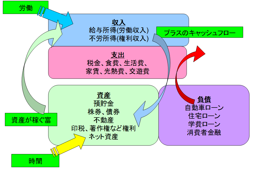 高収入であればあるほど、資産を構築し易くゴールに近づくことは間違いありませんが、負債や支出が大きすぎる場合は、低キャッシュフローになりますので要注意です。平均よりも低い収入の方は、無駄遣いを避けて可能な限りキャッシュフローのプラス幅を確保したいところです。