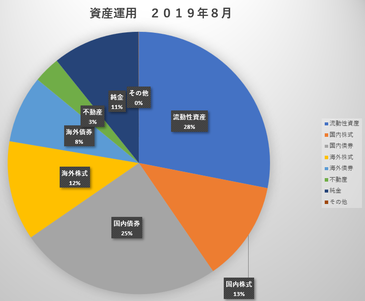 2019年8月のアセットアロケーションの状況です。少額ですが、持ち株積立もやっていてそれも国内株式に組み込みました。総額が増えているのは新規入金もあります。