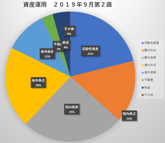流動性資産 583万円(21.1%) 国内株式 427万円(15.5%) 国内債券 702万円(25.4%) 海外株式 560万円(20.3%) 海外債券 291万円(10.6%) 不動産 77万円 (2.8%) 純金 120万円(4.3%) その他 2万円(0.1%) 合計 2762万円
